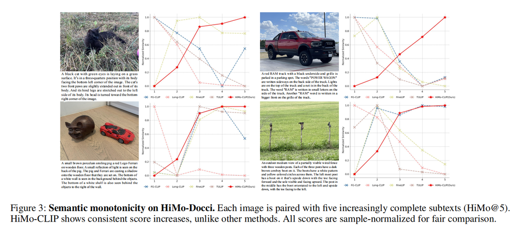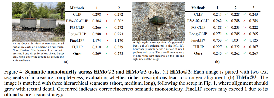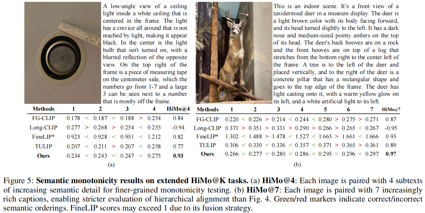 Figure.3 visualizes HiMo@5 trends on HiMo-Docci, where HiMo-CLIP consistently maintains monotonic similarity growth, unlike CLIP and Long-CLIP which often exhibit erratic drops, validating our core assumption that richer subtexts should yield stronger alignment. Figure.4 and Figure.5 extend this analysis with concrete examples for HiMo@2, @3, @4, and @7, showing that HiMo-CLIP reliably preserves correct score orderings even under deeper hierarchies. For instance, HiMo-CLIP achieves the highest qualitative HiMo@4 (0.93) and HiMo@7 (0.97), while FineLIP and TULIP exhibit score reversals, and Long-CLIP yields negative Pearson correlations ($-0.94$, $-0.95$). On shallower tasks, HiMo-CLIP maintains correct ordering at all steps, while FineLIP and TULIP show violations in HiMo@2 and HiMo@3, and even FG-CLIP fails on HiMo@3 despite strong quantitative scores. These results highlight the robustness and scalability of our representation-level alignment in modeling hierarchical semantic consistency across varied depths and content.