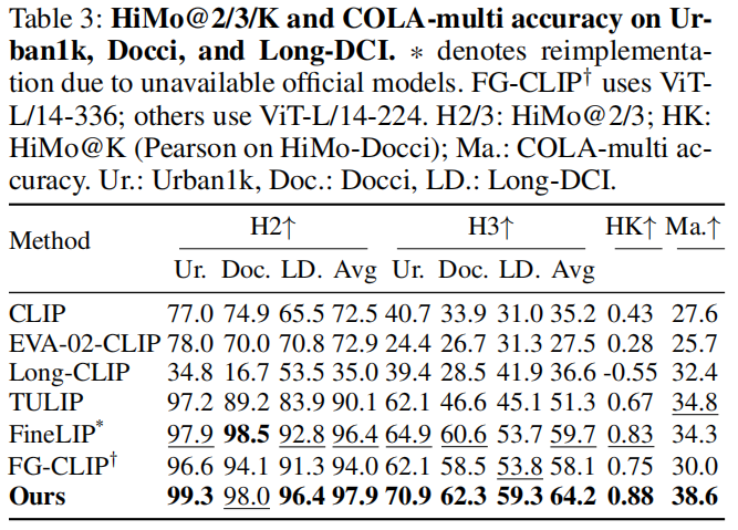 HiMo-CLIP consistently outperforms state-of-the-art methods across all long-text benchmarks. Under the ViT-L/14 backbone, our method achieves 93.0%/93.1%(I2T/T2I) on Urban1k, 82.4%/84.4% ((I2T/T2I)) on Docci, and 62.2%/61.9% (I2T/T2I) on Long-DCI, surpassing the strongest baseline (FineLIP) by pretty margins.